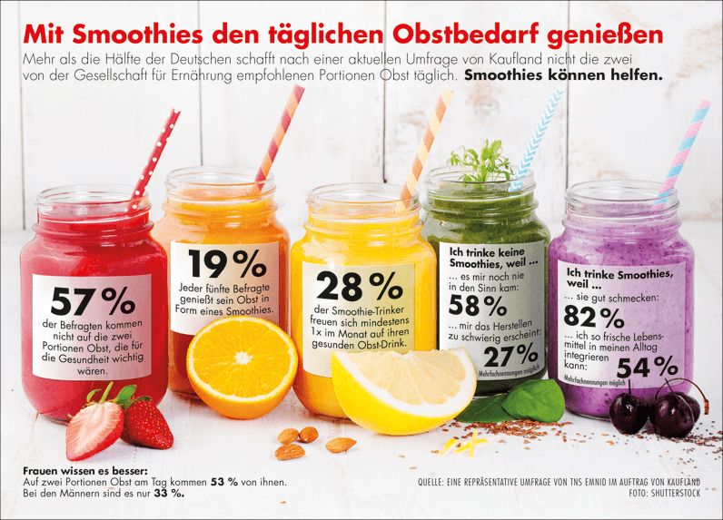 Wenn Sie Ihre Smoothies selbst herstellen möchten, benötigen Sie entweder eine Küchenmaschine oder einen leistungsstarken Mixer. Die Grundlage für den Obstdrink bilden frische oder gefrorene Früchte. Pfirsiche, Orangen, Granatäpfel und Beeren wie etwa Himbeeren, Heidelbeeren und Erdbeeren sind dabei ebenso gut geeignet wie sehr safthaltige Früchte wie Ananas und Wassermelonen. Eine besonders beliebte Zutat sind zudem Bananen, da sie dem Smoothie eine sämige Konsistenz und eine angenehme Süße verleihen. Auch „Green Smoothies“, die mindestens zur Hälfte aus Gemüse und/oder Salat (zum Beispiel Spinat, Rukola oder Chicoree) bestehen, liegen voll im Trend. Grüne Smoothies sind besonders reich an wertvollen Bitterstoffen. Diese wirken als Antioxidantien und können darüber hinaus beim Abnehmen helfen, da sie den Appetit hemmen. Zudem können Smoothies helfen, die von der Deutschen Gesellschaft für Ernährung empfohlene Tagesration Obst (zwei Portionen á 130 Gramm) zu verzehren. Eine Kaufland-Umfrage stellte bei den Deutschen schon zu geringen Obstkonsum fest.
